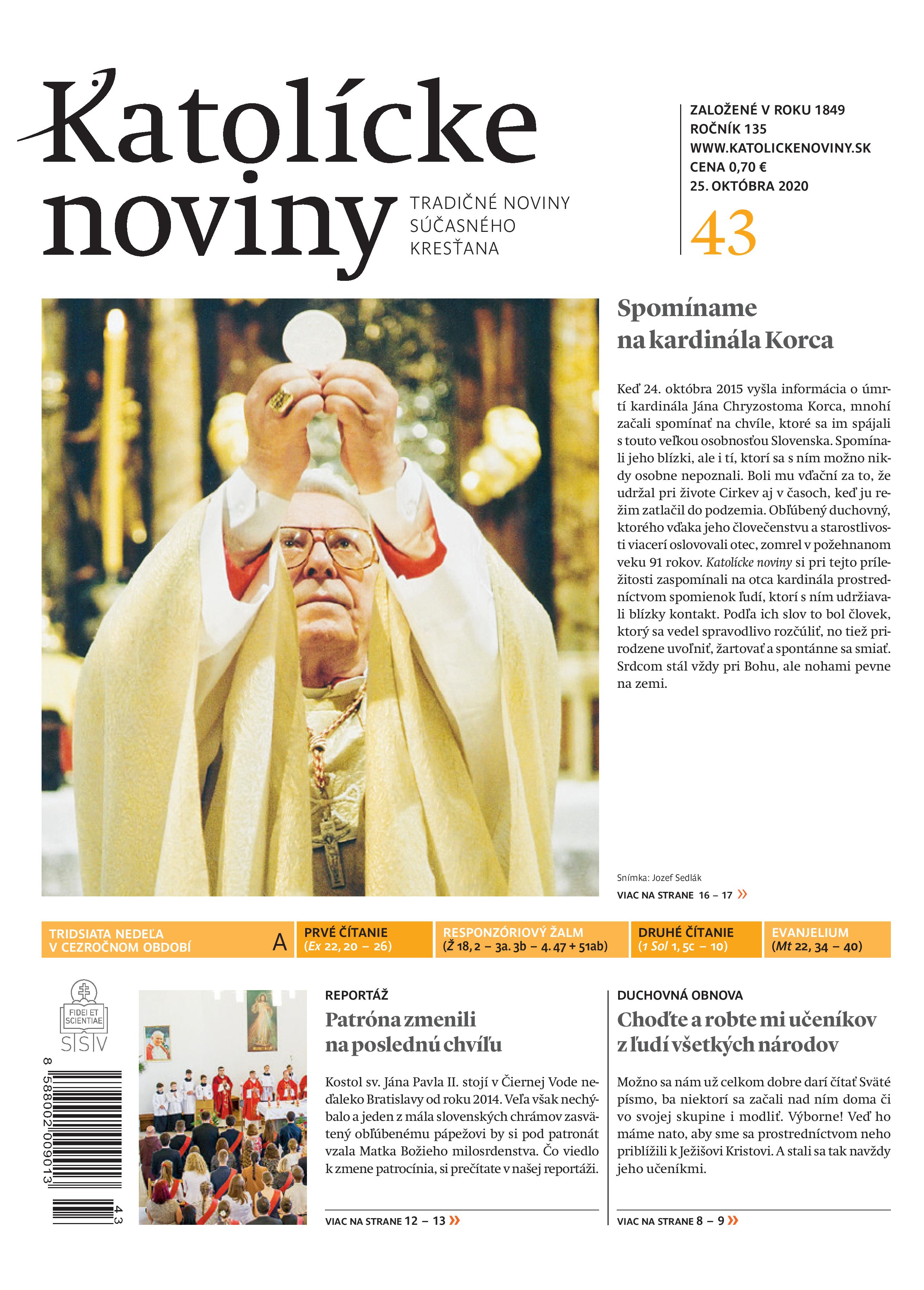 Najnovšie Katolícke noviny spomínajú na kardinála Jána Chryzostoma Korca, od ktorého smrti 24. októbra uplynie už päť rokov. Jednu z najväčších postáv moderných dejín Slovenska i Cirkvi si pripomínajú prostredníctvom spomienok riaditeľa Spolku svätého Vojtecha Ivana Šulíka, ktorý bol kardinálovým susedom po odchode do dôchodku, Jozefa Sedláka, ktorý fotografiou dokumentoval posledných 25 rokov života Jána Chryzostoma Korca, a Viliama Judáka, jeho nástupcu v úrade nitrianskeho biskupa.