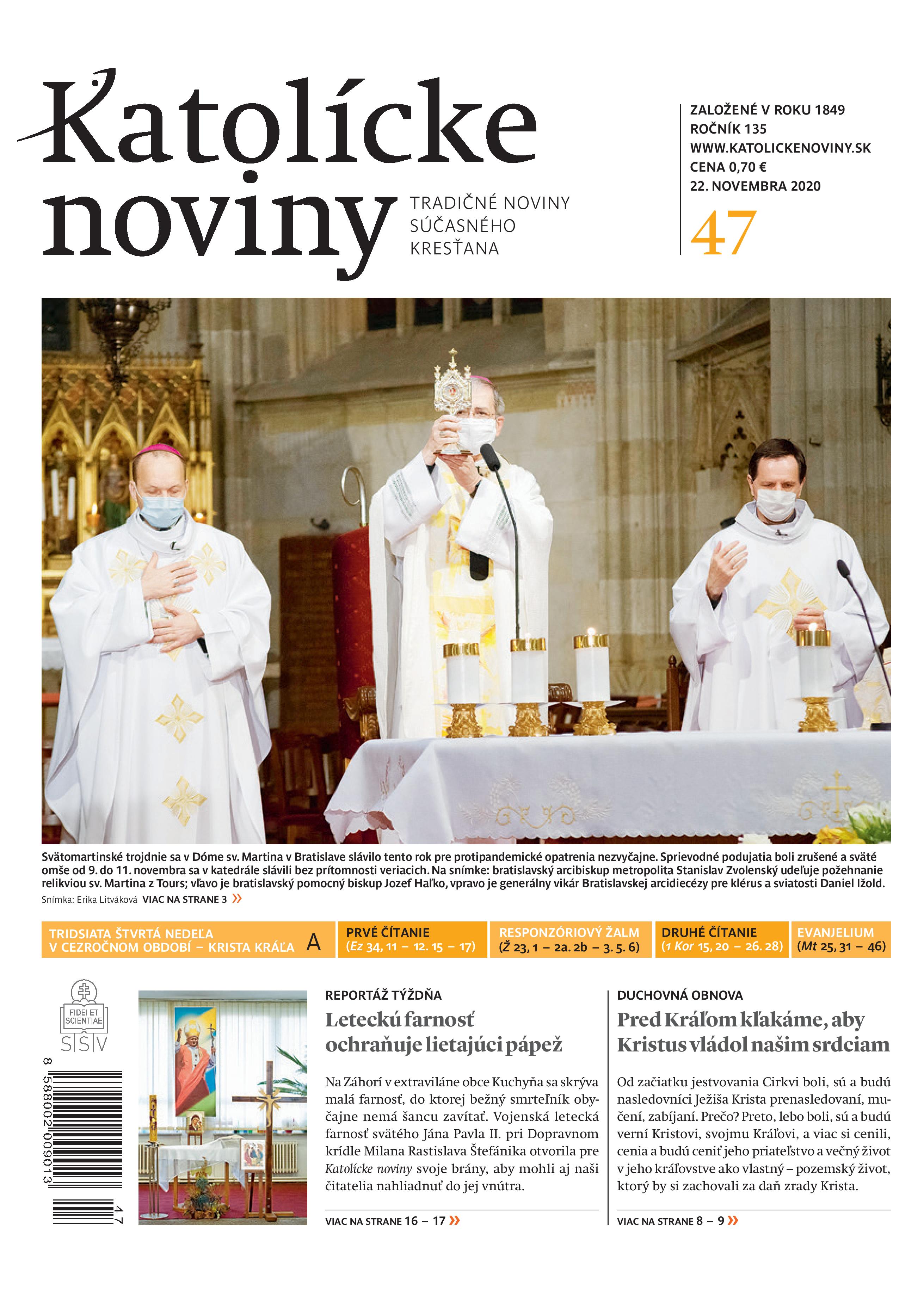 Najnovšie Katolícke noviny sa venujú slávnosti Krista Kráľa. Od začiatku jestvovania Cirkvi boli, sú a budú nasledovníci Ježiša Krista prenasledovaní, mučení, zabíjaní. Vernosť vyznávačov a mučeníkov môžeme vysvetliť a pochopiť ako najpravdivejšiu poklonu Kristovi Kráľovi. Svetskému kráľovi sa tiež mnohí klaňali v plnej oddanosti, ale mohlo to byť aj zo zachovania protokolu, z neúprimnosti či zo strachu. Svedkovia viery sa vždy svojím vyznaním, neraz i krvavým, poklonili Kristovi Kráľovi v plnej úprimnosti.