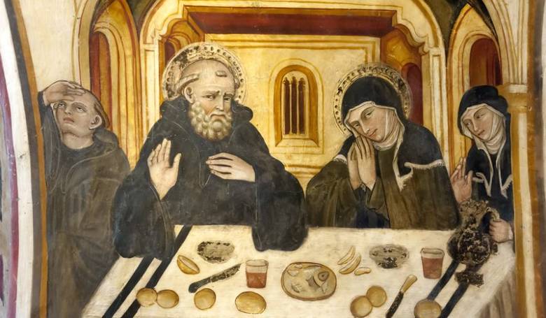 Detail nástennej maľby z 15. storočia, Svätý Benedikt z Nursie a svätá Školastika pri pôstnom jedle. Ilustračná snímka: profimedia.sk
