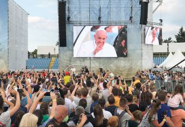 Pápež František bol mladým ľuďom ešte bližšie vďaka veľkorozmerným obrazovkám. Snímka: Anna Stankayová