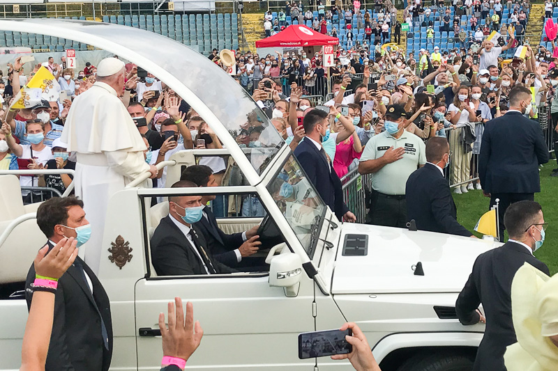 Úctu najvyššiemu predstaviteľovi Katolíckej cirkvi prejavili v Košiciach všetci prítomní vrátane policajnej ostrahy. Snímka: Anna Stankayová