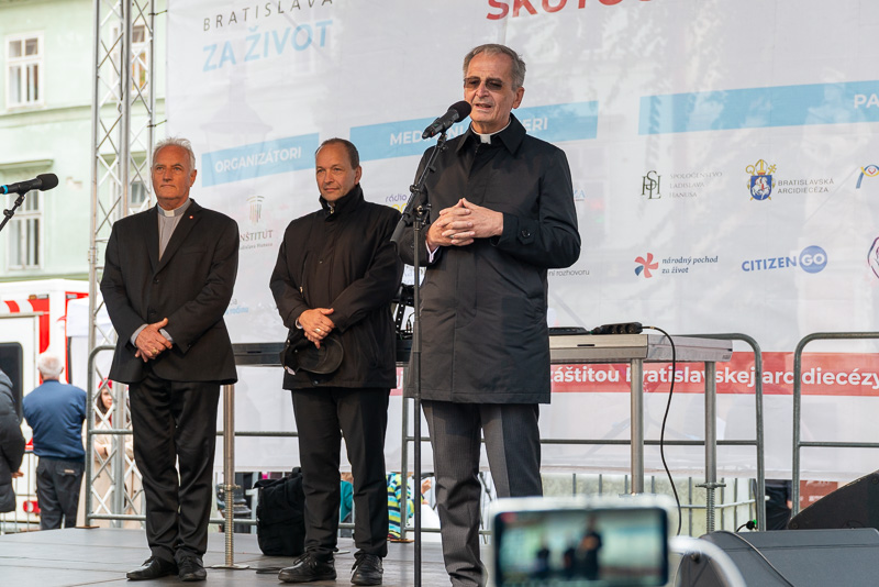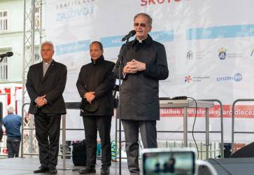Prítomným sa prihovoril aj bratislavský arcibiskup Stanislav Zvolenský, bratislavský pomocný biskup Jozef Haľko a Stanislav Diheneščík z Bratislavskej eparchie. Snímka: KN/Erika Litváková