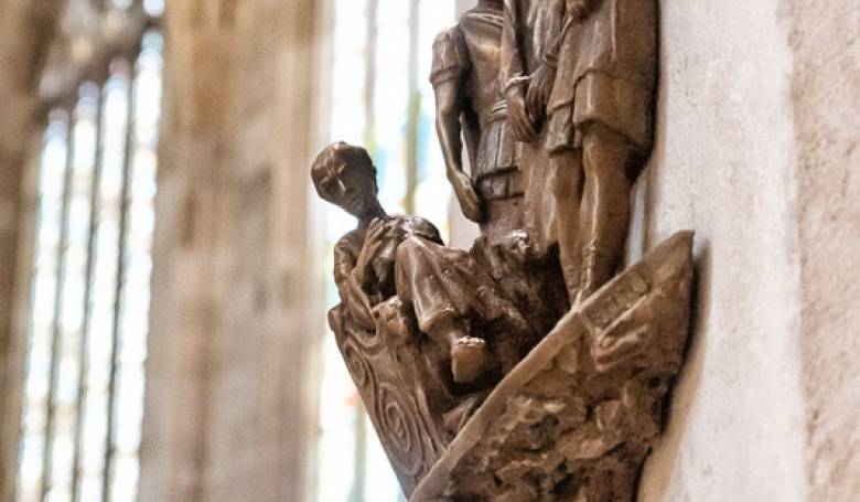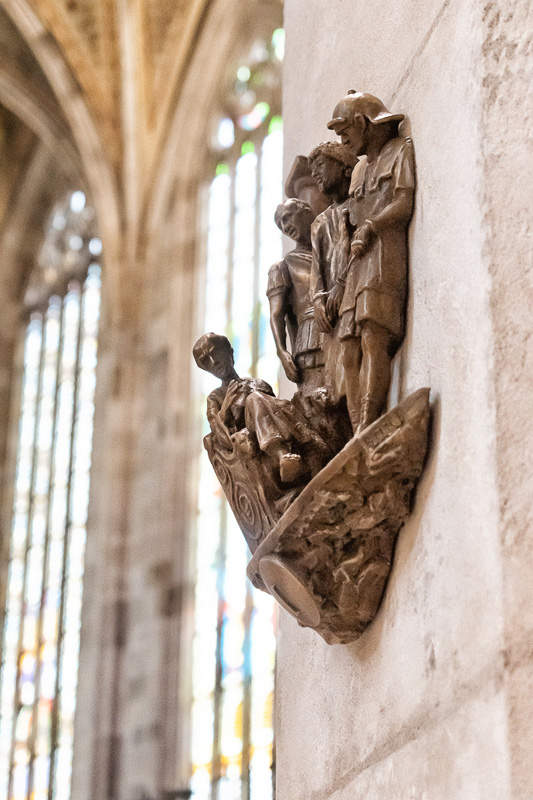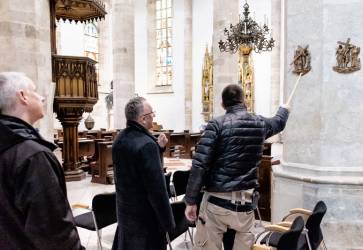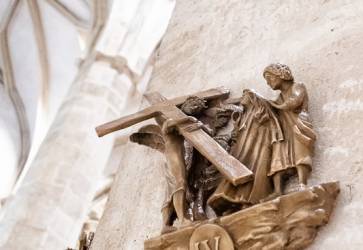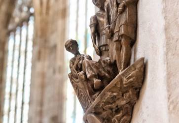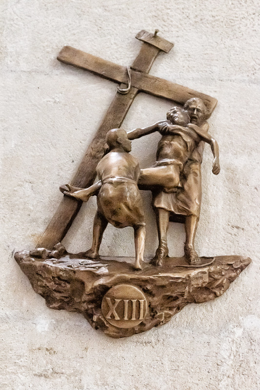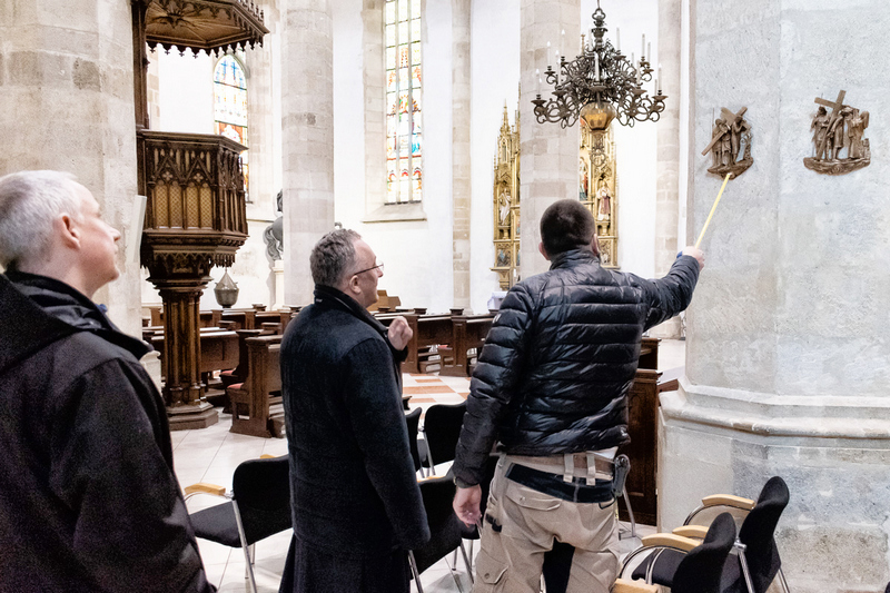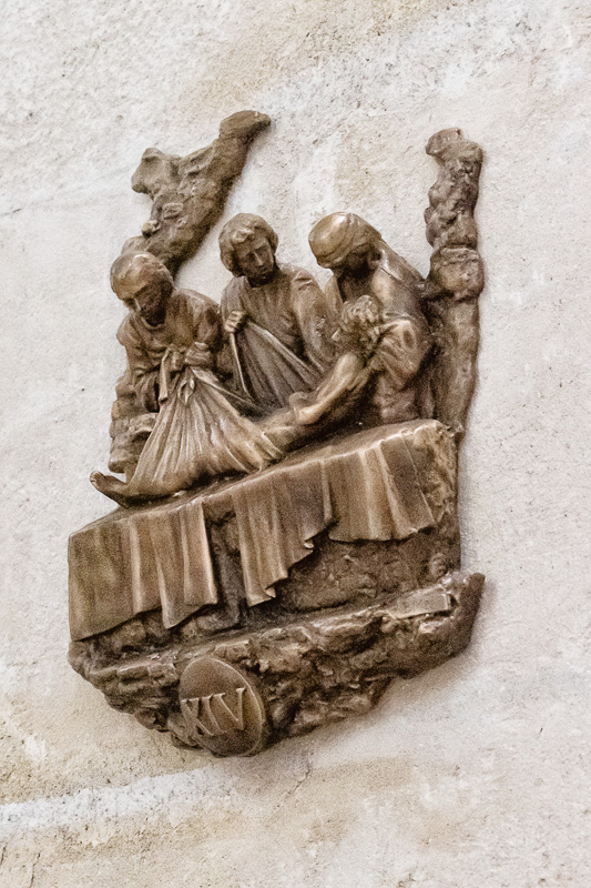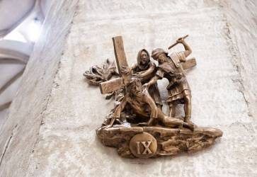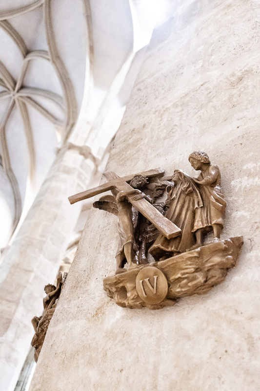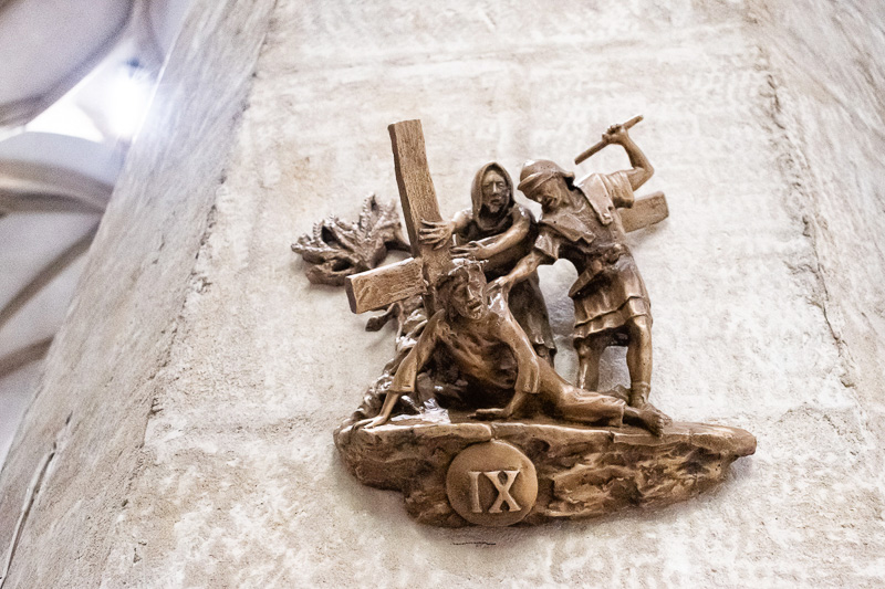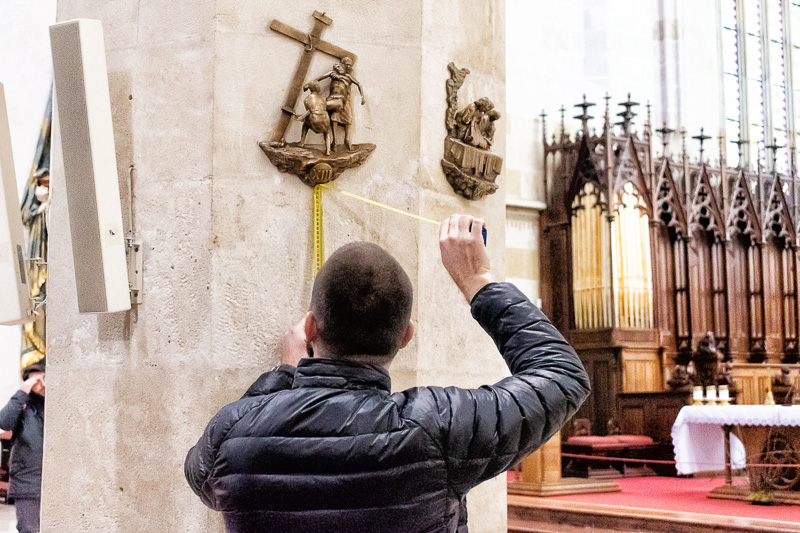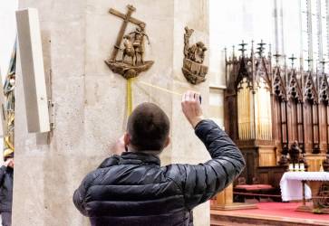 Kovový materiál jednotlivých zastavení korešponduje s kamenným povrchom stĺpov v katedrále.