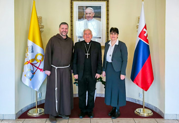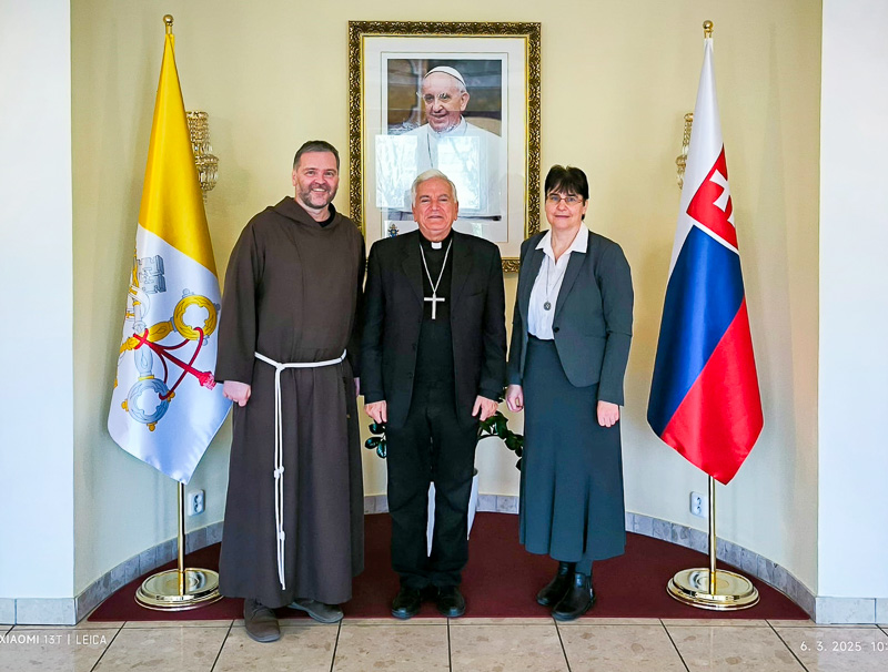 Nové vedenie rady Konferencie vyšších rehoľných predstavených na Slovensku predseda Miroslav Kulich, OFMCap (vľavo), a Renáta Jamborová, SSS, sa 6. marca stretli s apoštolským nunciom Nicolom Girasolim.