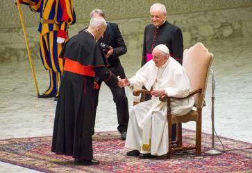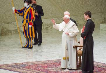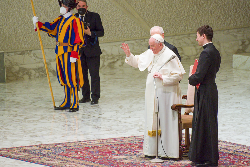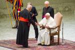 Pápež František privítal slovenských pútnikov v dobrej nálade a úsmevom na tvári. Snímka: Peter Dobrovský