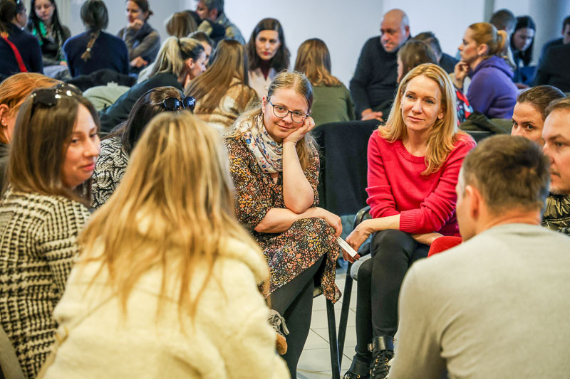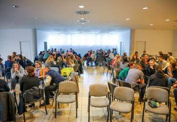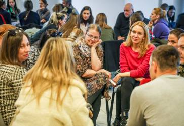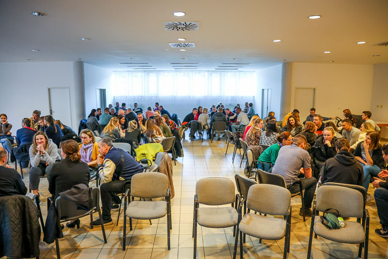 Rodičia v menších skupinkách premýšľajú, ako svojim deťom čo najlepšie vysvetliť desať Božích prikázaní. Snímka: Barbora Kullačová