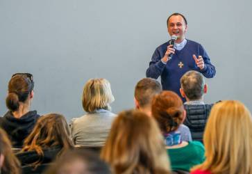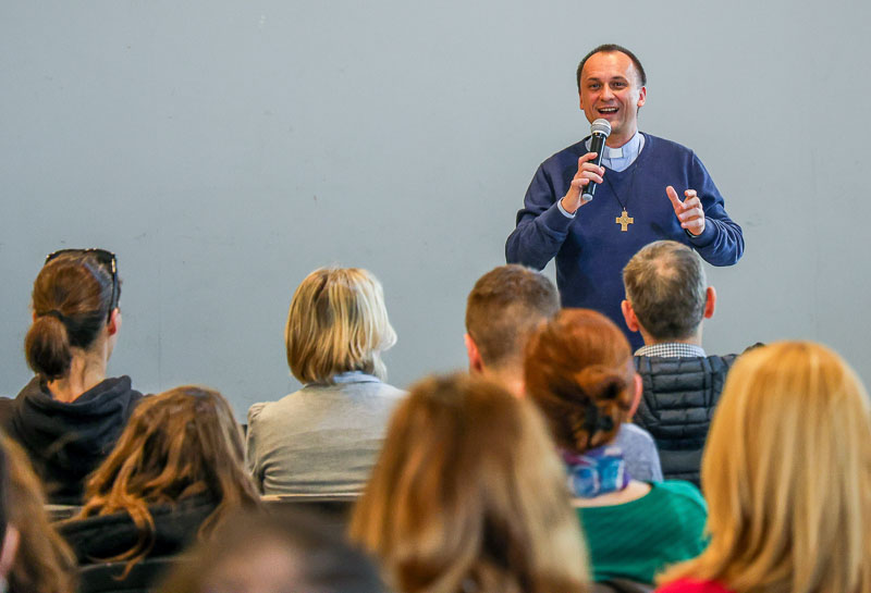 Don Marián Husár dokáže vliať svoj entuziazmus aj do rodičov prvoprijímajúcich detí. Nie všetci totiž chápu tajomstvá našej viery, napríklad svätej spovede či Eucharistie. Snímka: Barbora Kullačová