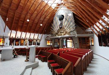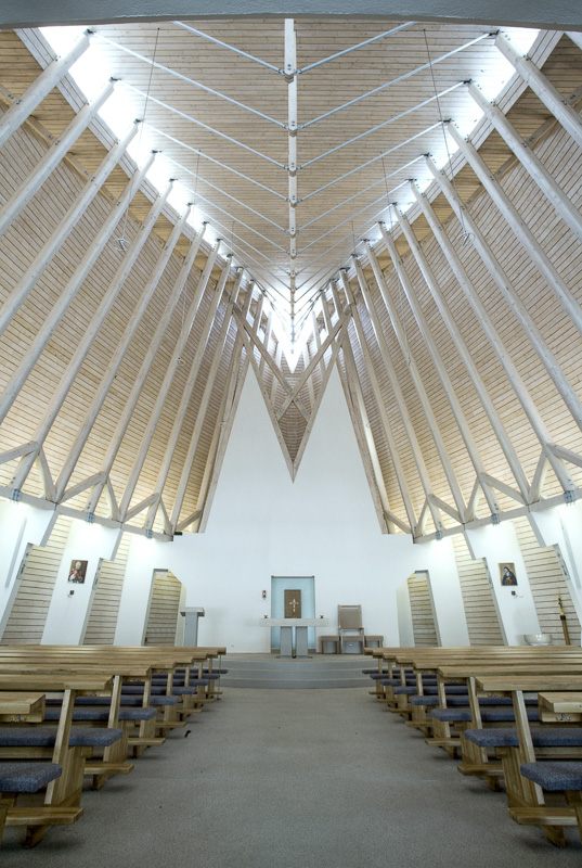 Realizovaný kostol vznikol na základe víťazného návrhu architektonickej súťaže. Porota popri organickom začlenení kostola do organizmu sídliska ocenila aj vytvorenie sakrálneho námestia medzi kostolom a farou. Podľa mňa je najsilnejší moment riešenie interiéru, založené na používaní ekologických stavebných materiálov. Pre veriacich vytvára intímnu domovskú atmosféru. (Snímka z interiéru nezachytáva toľko odborníkmi diskutovanú maľbu za hlavným oltárom – pozn. red.)