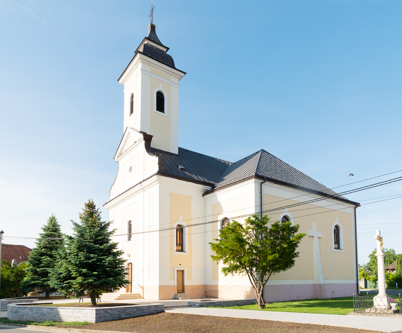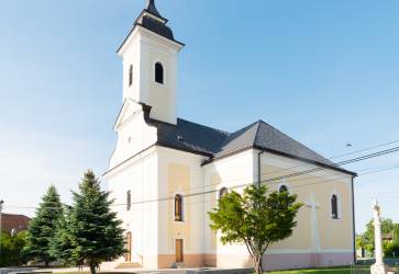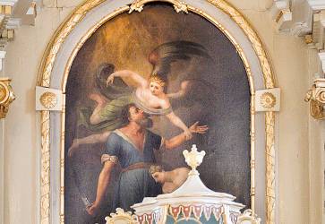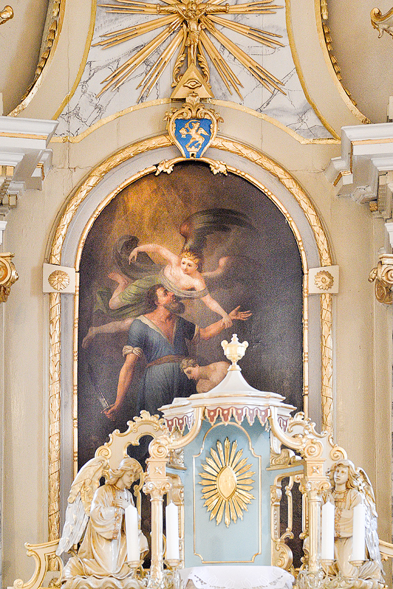 Obraz na hlavnom oltári kostola v Abraháme zobrazuje anjela, ktorý zadržiava ruku Abraháma pri obetovaní svojho syna Izáka. Snímka: Erika Litváková