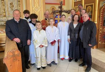 Košická eparchia: Nedeľné slávenie v Chráme Narodenia presvätej Bohorodičky v Michalovciach. V pozadí synodálny reliéf Košickej eparchie. Snímka: Samuel Rinik