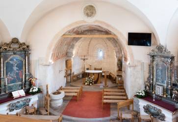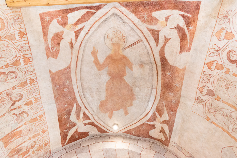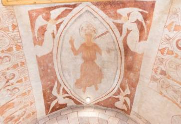 Charakteristické pre najstarší žilinský kostol sú fresky v presbytériu. Nad veriacimi drží ochrannú ruku sv. Štefan, kráľ (socha vpravo). Snímka: Anna Stankayová