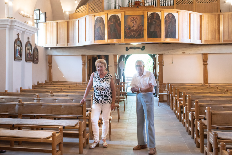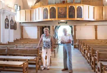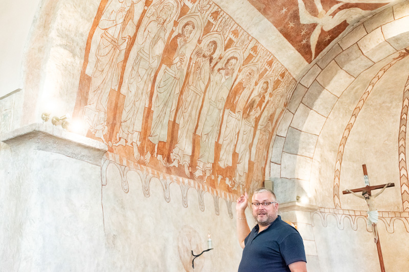 Farár Štefan Fábry ukazuje na stenách postavy dvanástich apoštolov a medzi nimi veže, ktoré znázorňujú nový Jeruzalem. Snímka: Anna Stankayová