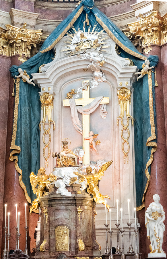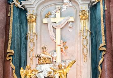 Pri pohľade na oltár sa ocitáme na Kalvárii. Pod krížom sú po bokoch sochy sv. Jána Evanjelistu a sv. Márie Magdalény. Sedembolestná Panna Mária s Ježišovým mŕtvym telom je nad svätostánkom, kde je živý Ježiš Kristus, ktorého prijímame. Snímka: AS