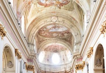 Fresky sú dielom francúzskeho maliara Jeana Josepha Chamanta, ktorý maľoval aj zámok v Holíči, avšak tam sa žiadna jeho maľba nezachovala. Oltárne obrazy pochádzajú z 18. storočia od viedenského maliara Jána Lukáša Krackera. Snímka: Anna Stankayová