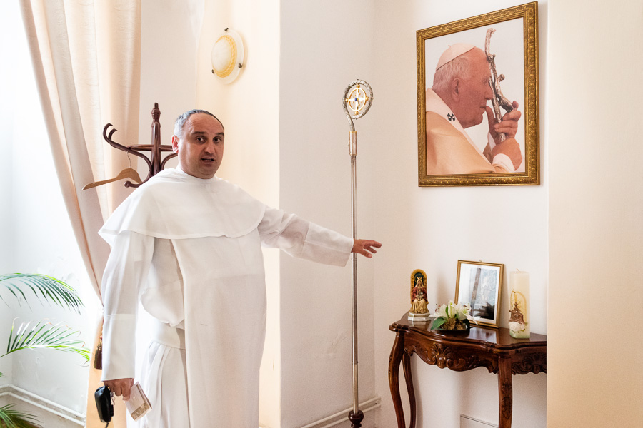 Farár Martin Lehončák ukazuje spomienku na návštevu pápeža Jána Pavla II. v roku 1995. Rovnako i biskupa Dominika Tótha, ktorý sa pravidelne zúčastňoval na fatimských sobotách, pripomína jeho biskupská berla. Snímka: Anna Stankayová
