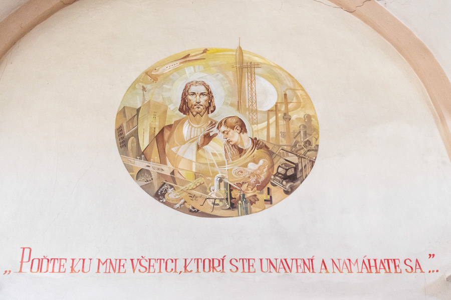 V Kostole sv. Alžbety je napríklad Ježiš v modernej dobe, v továrni obklopený raketou, lietadlom a drží hlavu unaveného robotníka. Snímka: Anna Stankayová