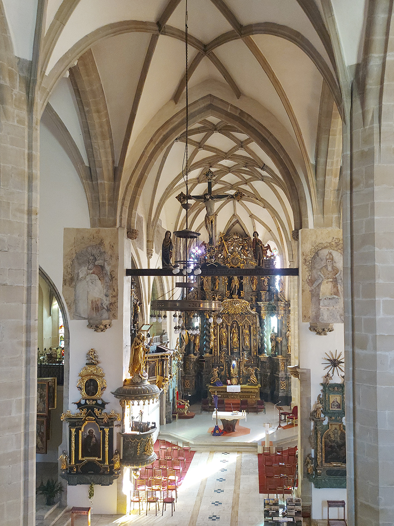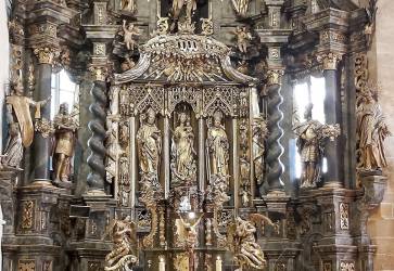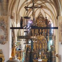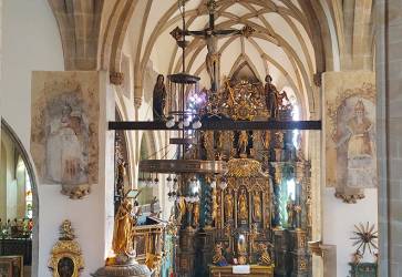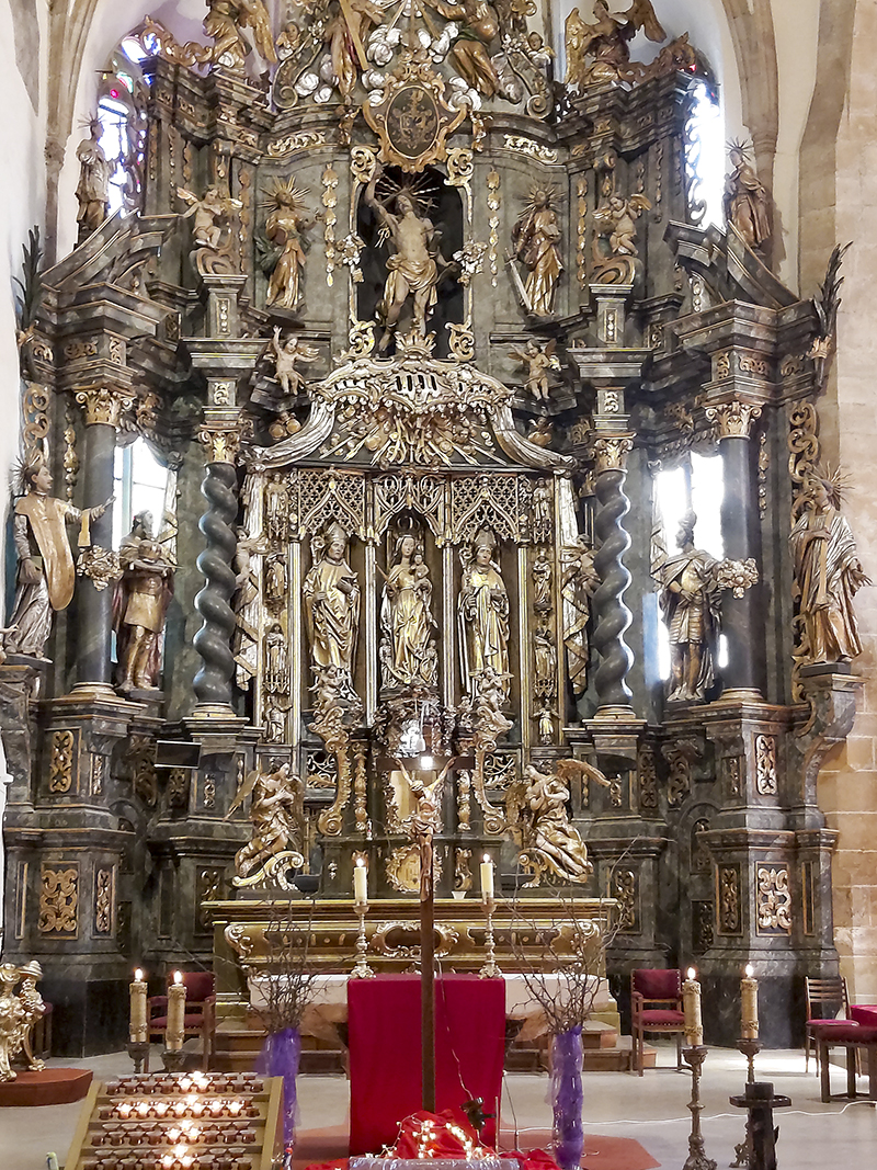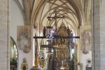 Hlavný oltár s barokovo-gotickými prvkami vznikol v rokoch 1490 až 1506. Uprostred neho sa nachádza plastika Panny Márie s malým Ježišom v náručí, po jej pravici je plastika sv. Mikuláša a na ľavej strane plastika sv. Vojtecha, druhého pražského bisk