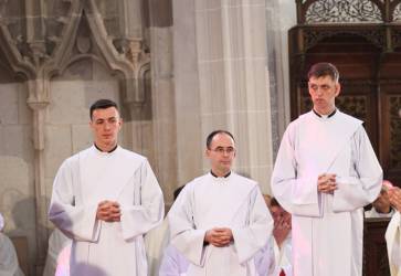 Miloš Jaklovský, Ján Pčolinský a Maroš Varga (na snímke zľava) prijali kňazskú vysviacku v košickom Dóme sv. Alžbety. Snímka: Jaroslav Fabian