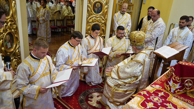 Pred vladykom Petrom Rusnákom počas kňazskej vysviacky v Ľutine kľačia zľava: Miroslav Baran, Mário Buraľ, Jakub Jurčišin a Peter Koršňak. Snímka: Štefan Keruľ-Kmec ml.