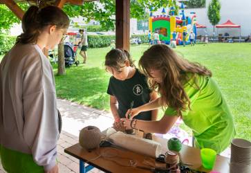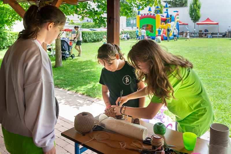 Mladí dobrovoľníci z farnosti si pripravili pestré aktivity a ochotne pri nich pomáhali. Simonka (v strede) si zhotovila špagátový telefón. Snímka: Erika Litváková
