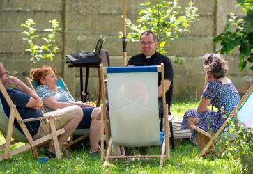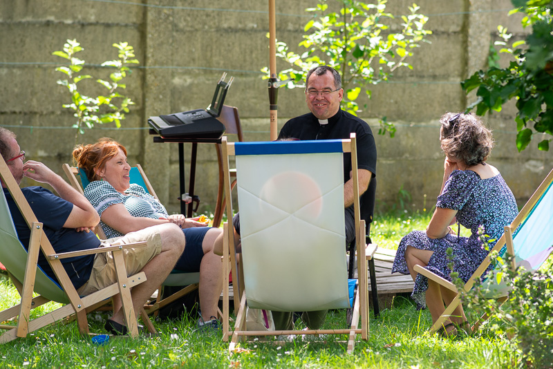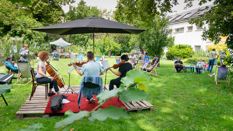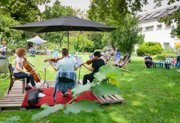 Vo farskej záhrade si mohli návštevníci oddýchnuť pri tónoch sláčikového tria. Snímka: Erika Litváková