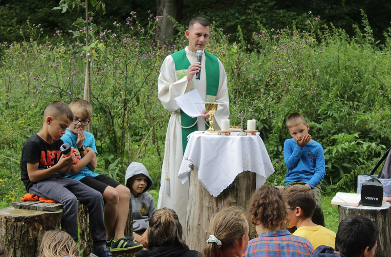 Slávenie svätej omše s farárom farnosti Lukášom Uváčikom na tábore. Snímka: archív farnosti Teplická-Kráľovnej rodiny