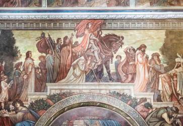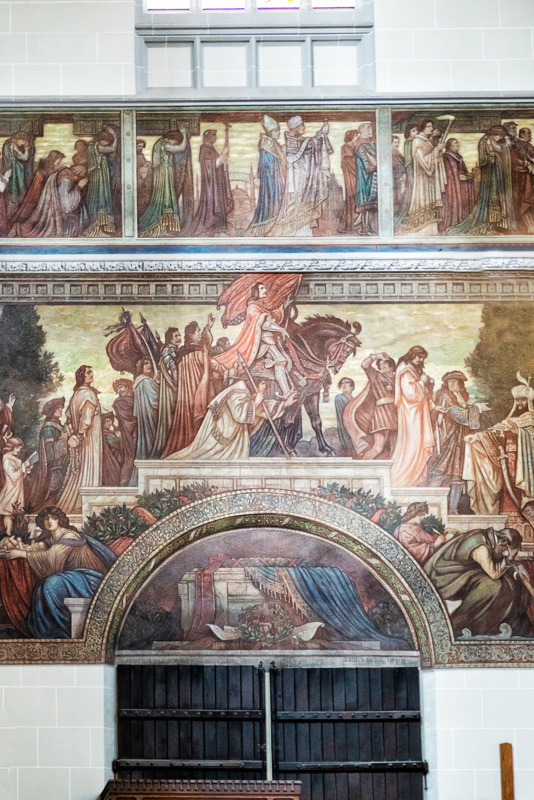 10. Neprehliadnuteľná nástenná maľba nad severným portálom z rokov 1914 – 1916 predstavuje život vodcu protihabsburského povstania Františka II. Rákociho vo forme schodov.Snímka: Erika Litváková