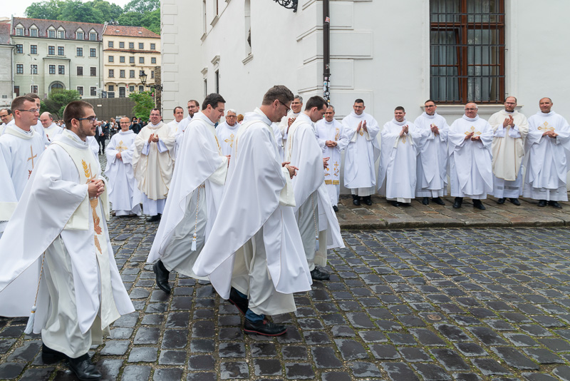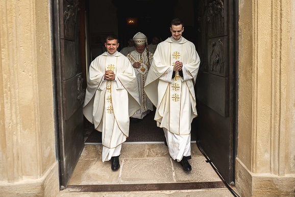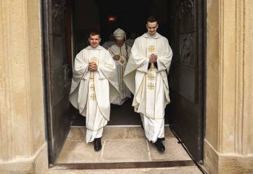 Nitrianski novokňazi vychádzajú z katedrálneho chrámu v spoločnosti diecézneho biskupa Viliama Judáka. Snímka: Marek Mucha