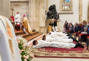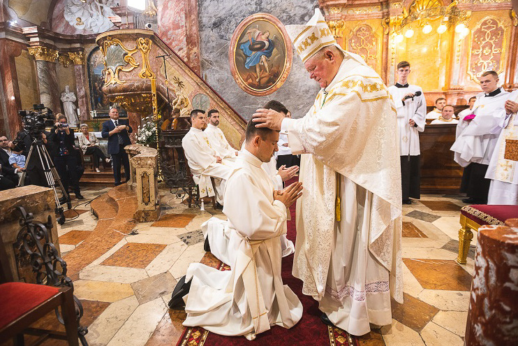 Bratislavský arcibiskup Stanislav Zvolenský vysvätil v Katedrále sv. Martina štyroch novokňazov: Martina Giru, Mária Jančoviča, Tamása Pammera a Martina Surového. Snímka: Erika Litváková