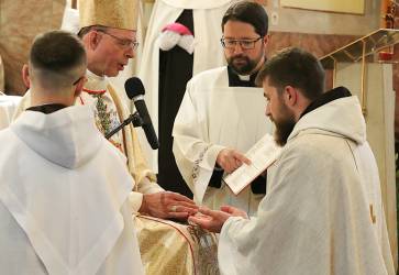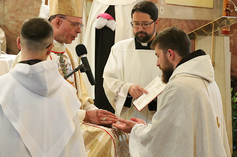 V Bazilike sv. Emeráma prijal z rúk nitrianskeho biskupa Viliama Judáka kňazskú vysviacku Lukáš Frank a Dominik Tisovský. Snímka: Marek Mucha