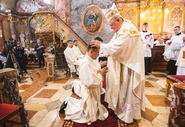 Bosí karmelitáni prežívali v Bazilike Návštevy Panny Márie na Starých Horách veľkú radosť. Banskobystrický biskup Marián Chovanec vysvätil Petra Beňa za kňaza. Snímka: Radovan Rehák