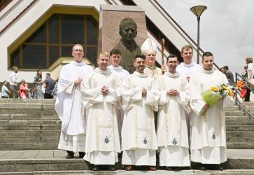 Žilinský biskup Tomáš Galis vysvätil štyroch diakonov (vpredu) a troch novokňazov (v hornom rade). Snímka: Jozef Škultéty