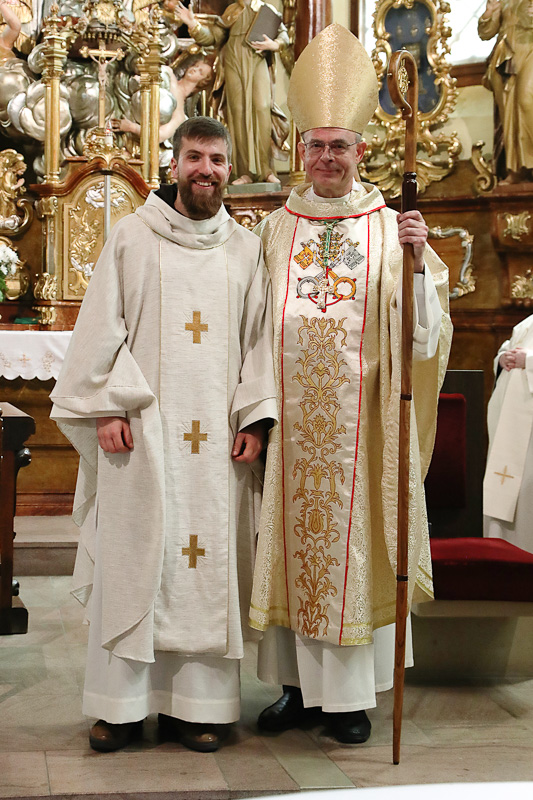 Novokňaz z rehole bosých karmelitánov Peter Beňo po vysviacke s banskobystrickým biskupom Mariánom Chovancom. Snímka: Radovan Rehák