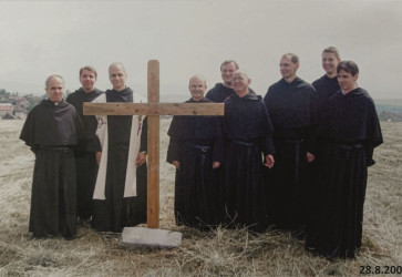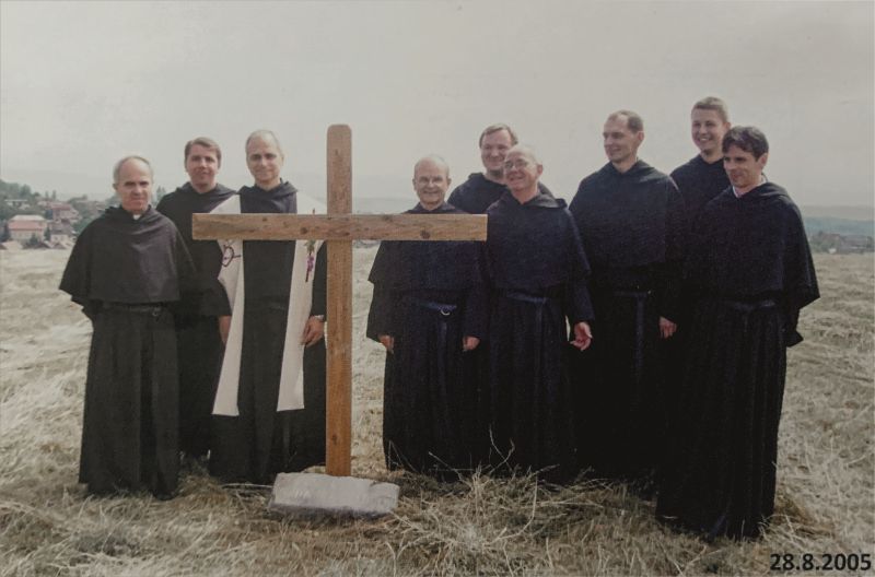 Robert Francis Prevost (tretí zľava), dnes už pápež Lev XIV., na archívnej snímke pri návšteve slovenskej komunity augustiniánov v Košiciach v roku 2005. Archív -JP-