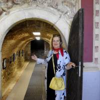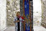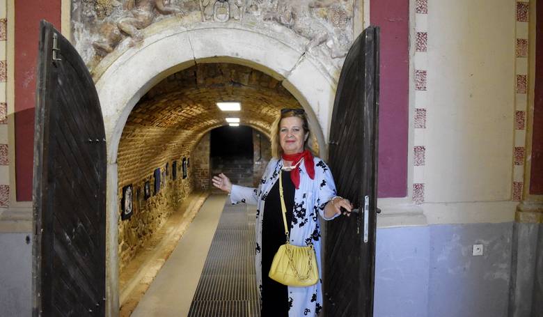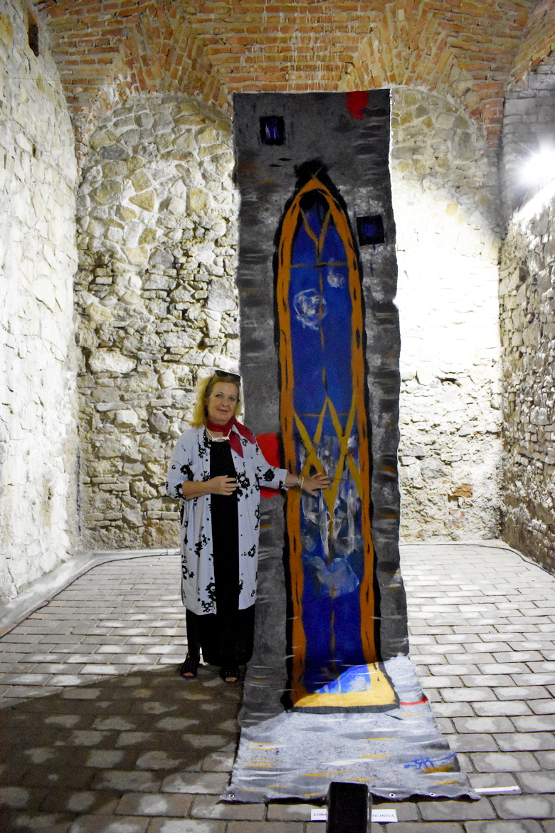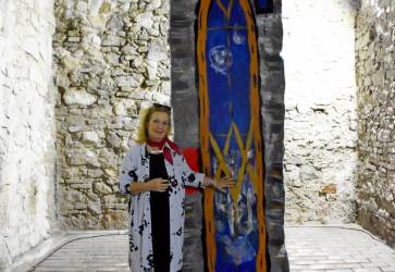 Ľuba Suchalová Harichová pri 6,5-metrovej tapisérii zobrazujúcej neogotické okno, časť dverí z kaštieľa v Galante. Snímka: Zuzana Artimová
