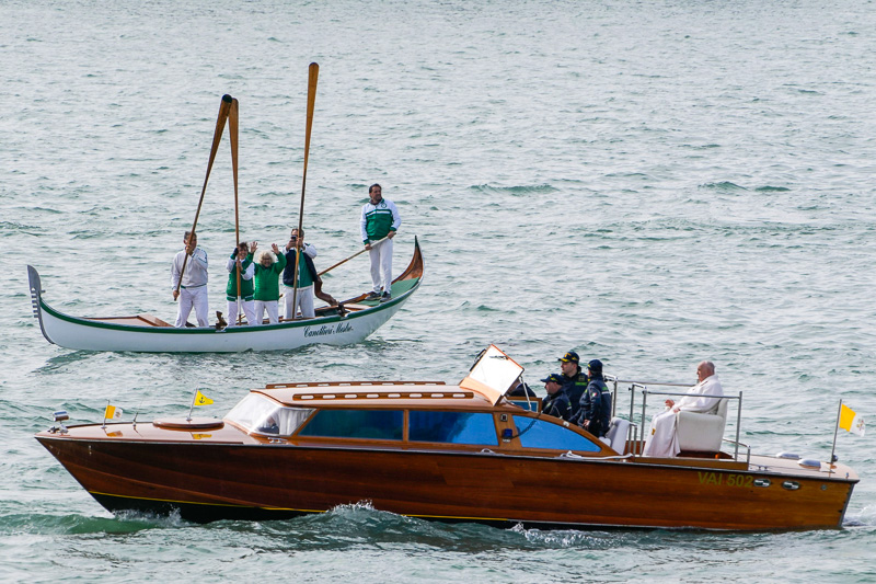 Pápež František 28. apríla navštívil Benátky. Radosť z pápežovej prítomnosti mali aj benátski gondolieri, ktorí Svätého Otca zdravili zo svojich lodiek.Snímka: profimedia.sk