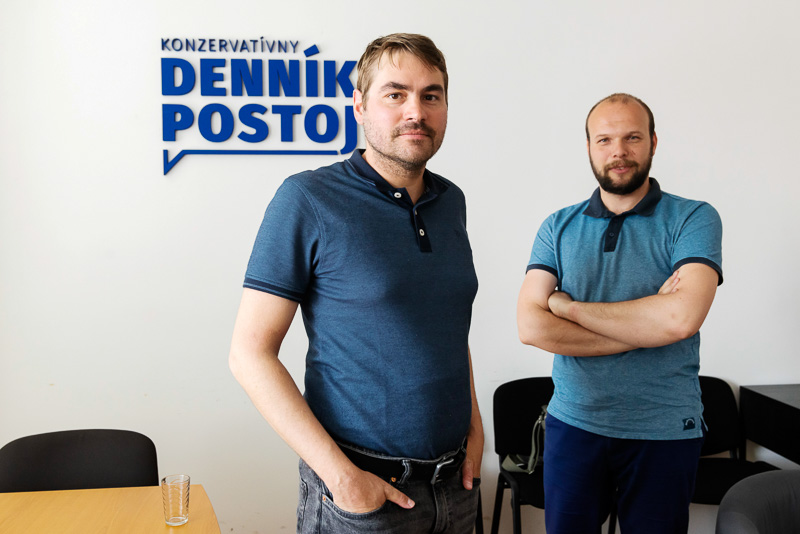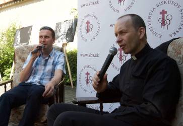 Spravodajský servis zo života Cirkvi doma aj vo svete ponúka Tlačová kancelária Konferencie biskupov Slovenska. Na snímke jej člen Michal Lipiak (vľavo) počas besedy s biskupom Jozefom Haľkom. Snímka: Peter Zimen
