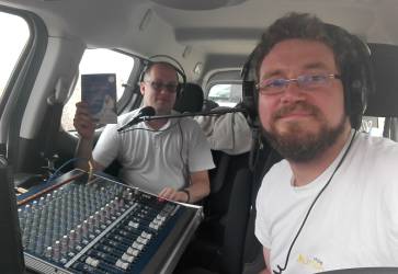 Vo vysielacom voze. Redaktor kňaz Pavol Jurčaga a technik Peter Ondrejka. Snímka: archív Rádia Lumen