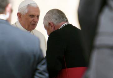 Štefan Sečka s emeritným pápežom Benediktom XVI. na generálnej audiencii počas návštevy slovenských biskupov ad limina apostolorum vo Vatikáne v júni 2007 Snímka: -TK KBS-/Peter Zimen