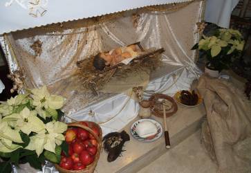 Pastieri na polnočnú omšu prinášajú Jezuliatku tradičné dary – jablká, syr, klobásy. Snímka: archív obce Lendak