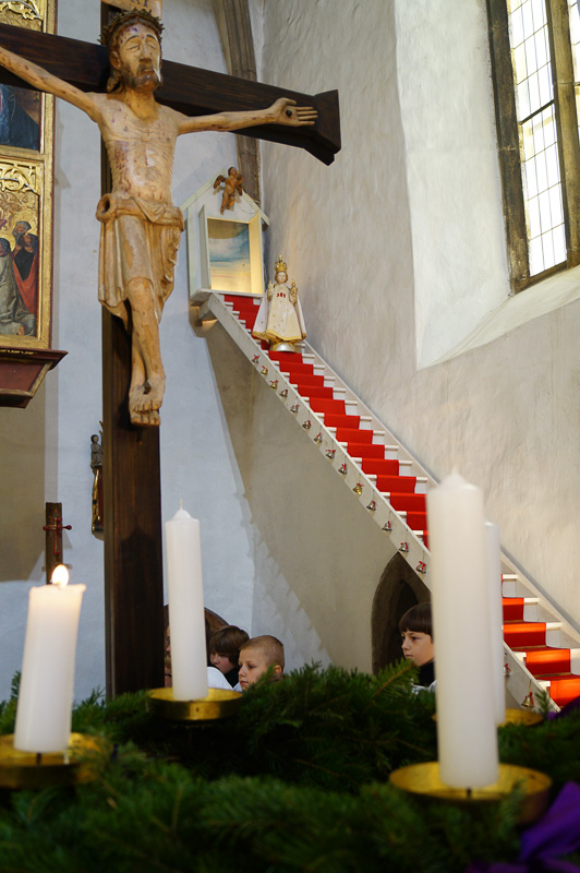 Adventné schodíky v kostole, ktorými si deti odpočítavali dni do Vianoc. Jezuliatko postupovalo zhora dole. Snímka: archív obce Lendak