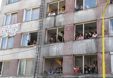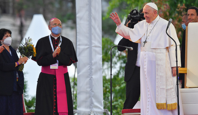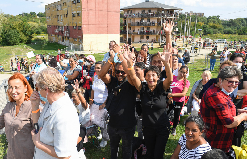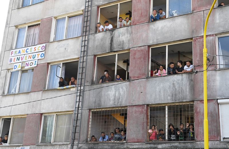Pápeža Františka privítali na sídlisku Luník IX v Košiciach s veľkou radosťou. Medzi prítomnými bol aj biskup Vladimír Fekete, SDB, z Azerbajdžanu. Snímka: TASR/TKKBS/Michal Svítok