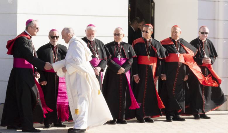 Bratislavský arcibiskup Stanislav Zvolenský si srdečne podáva ruky so Svätým Otcom.Snímka: Peter Slovák