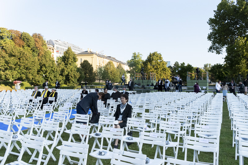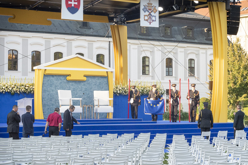 Skôr ako sa pápež i prezidentka republiky usadili do bielych kresiel, bolo potrebné všetko dôkladne pripraviť. Snímka: Peter Slovák