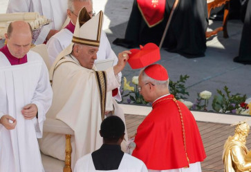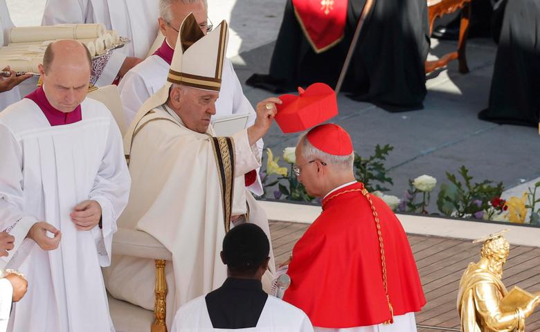Pápež František položil kardinálsky biret na hlavu Roberta Prevosta 30. septembra 2023 na vatikánskom námestí. Snímka: profimedia.sk