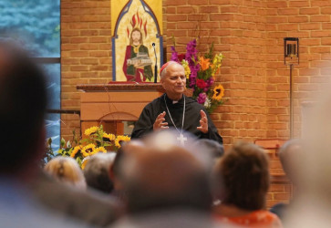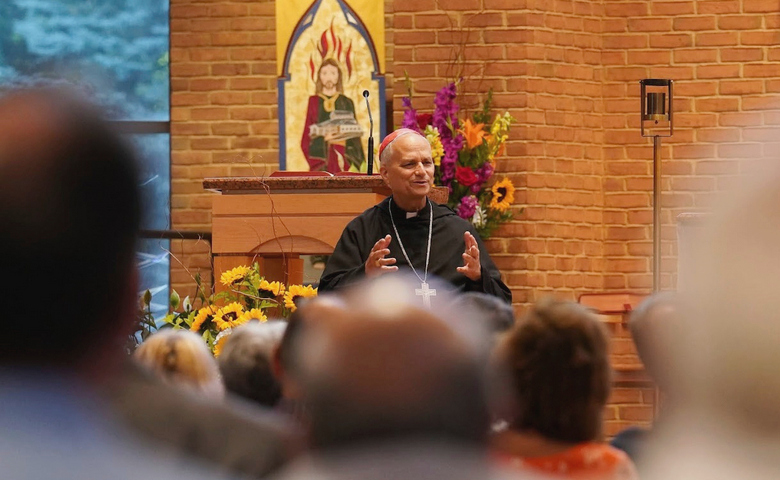 Kardinál Prevost počas príhovoru vo farnosti sv. Júdu v New Lenoxe, Illinois, v roku 2024. Snímka: profimedia.sk