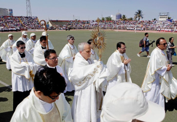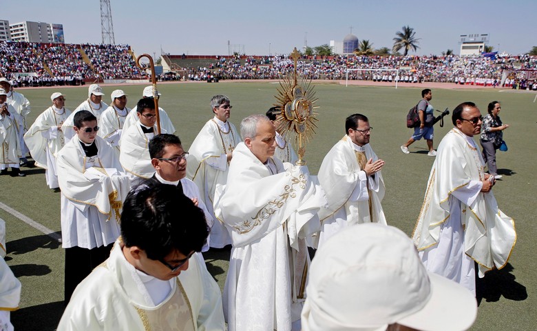 Eucharistická procesia na slávnosť Najsvätejšieho Kristovho tela a krvi na štadióne v peruánskom meste Chiclayo 19. júna 2015. Snímka: profimedia.sk