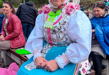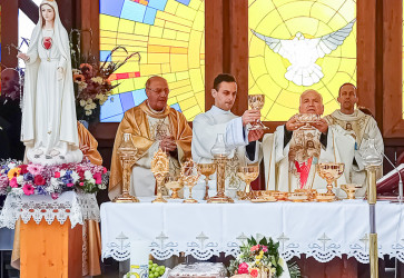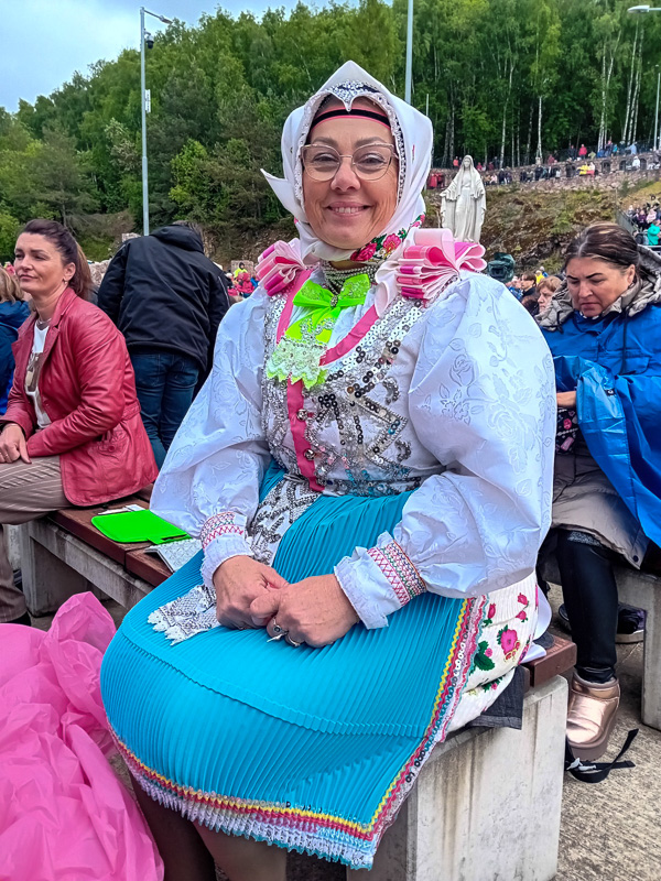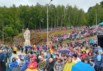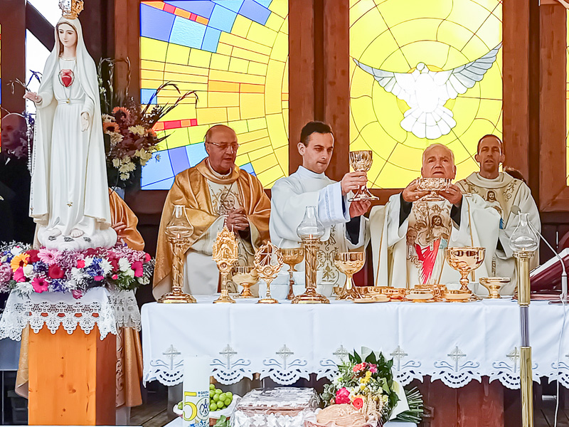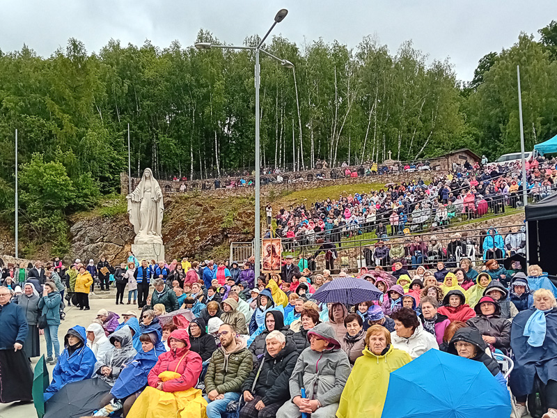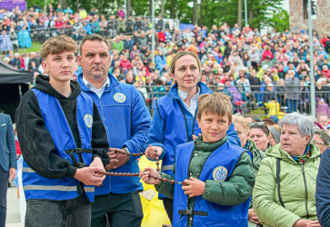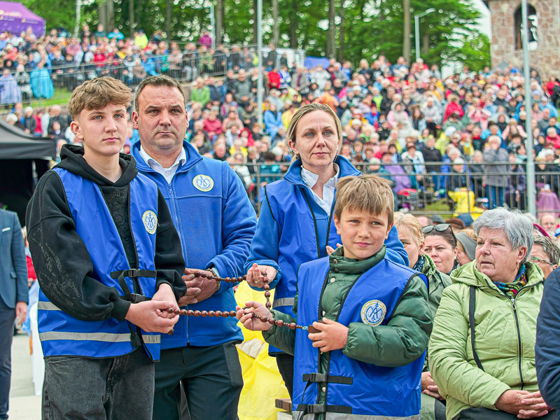 Členovia Rodiny Nepoškvrnenej priniesli ako jeden z obetných darov veľký ruženec. Snímka: Jozef Kavoň/Človek a Viera