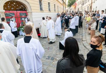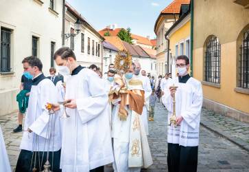 Tradičná slávnostná eucharistická procesia so zastaveniami viedla Kapitulskou ulicou, na ktorej sídlia aj Katolícke noviny. Snímka: Erika Litváková