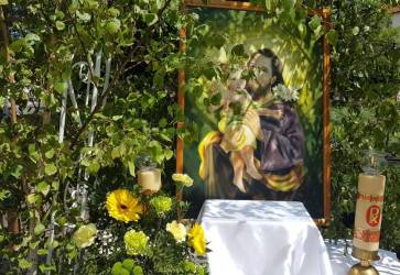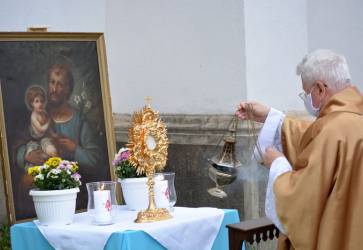 Bratislavský arcibiskup Stanislav Zvolenský incenzuje jedno zo zastavení eucharistickej procesie na Kapitulskej ulici v Bratislave. Snímka: Erika LitvákováSnímka: Erika Litváková